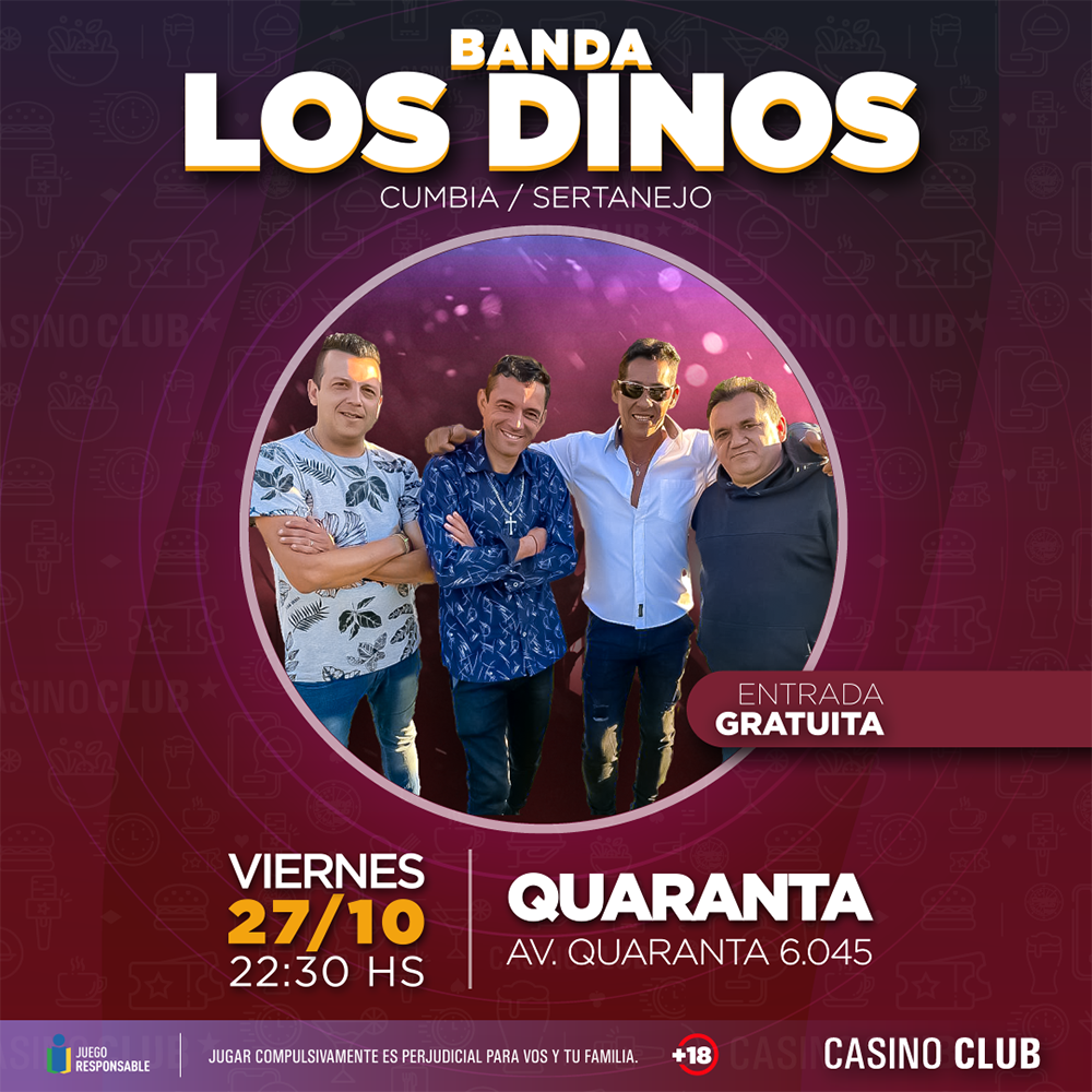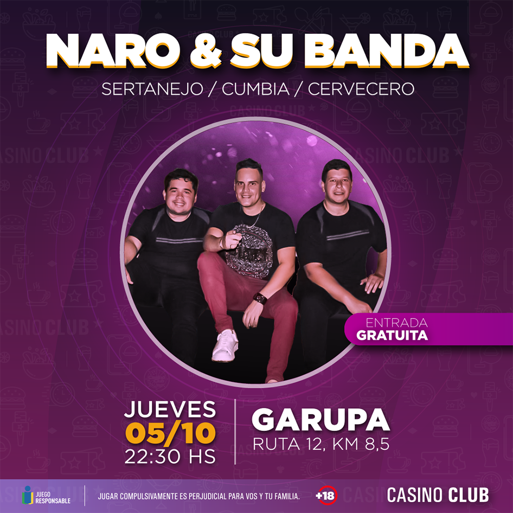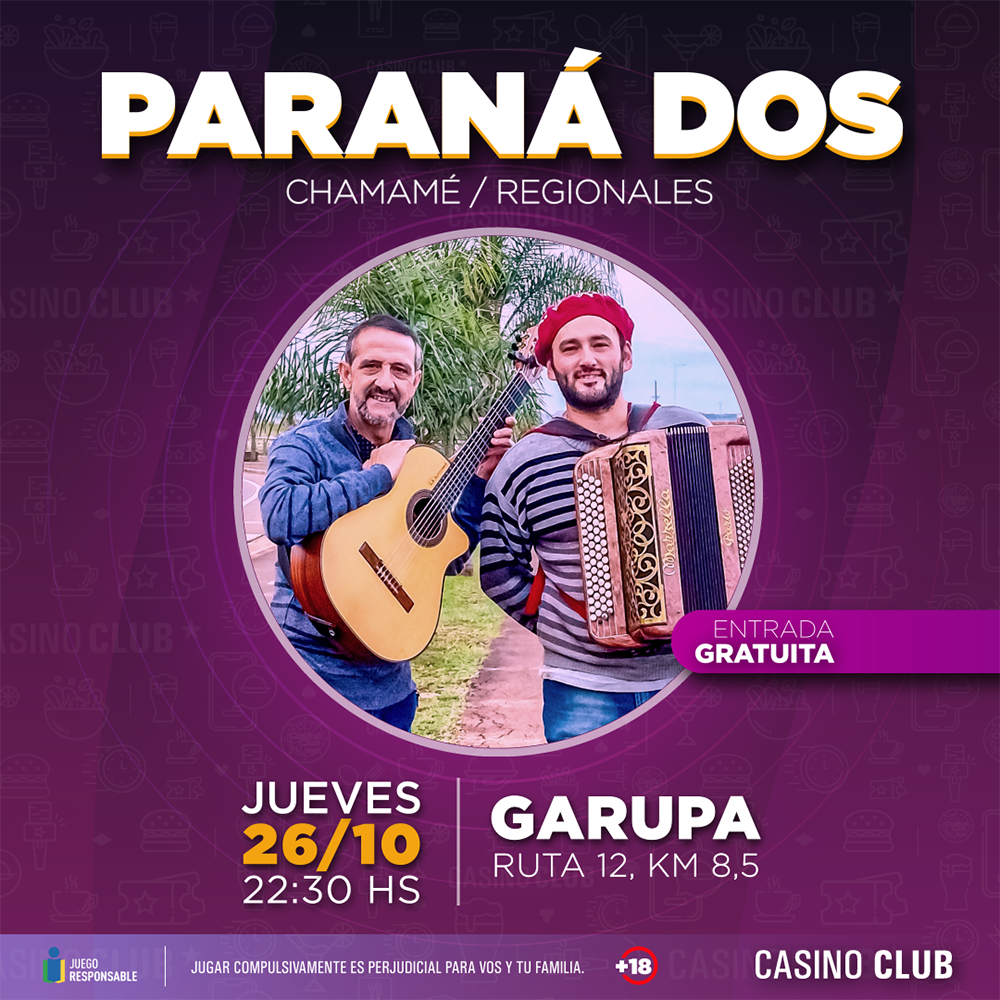 El Casino Club ofrecerá shows en vivo todos los jueves, viernes y sábado de octubre. Así habrá diversión los jueves en su sala de Garupá, ubicada sobre la ruta Nacional 12 en el kilómetro 8,5; los viernes en su local de Quaranta, ubicado sobre la avenida Quaranta 6045; mientras que Casino Central, sobre San Lorenzo 1950 irá variando los entre los tres días. En todos los casos, siempre desde las 22.30 horas.