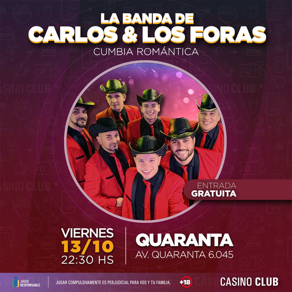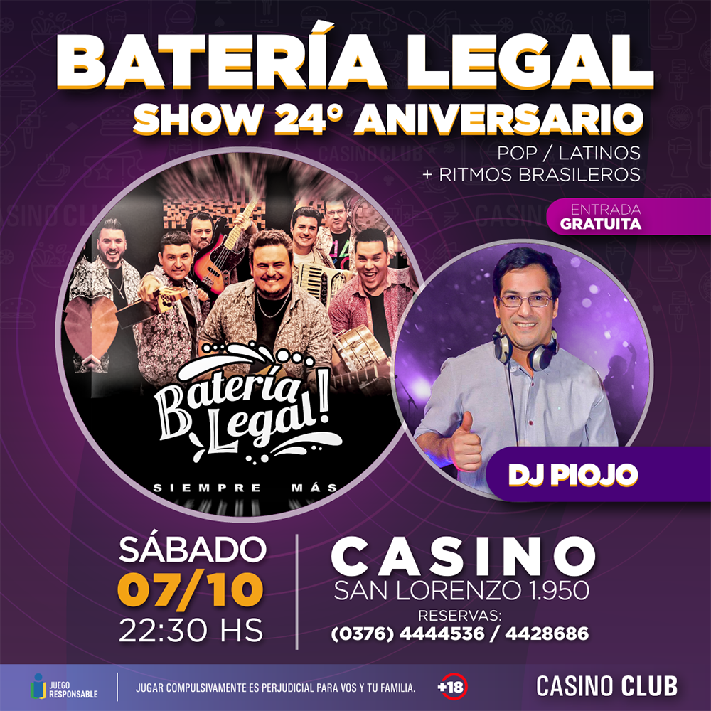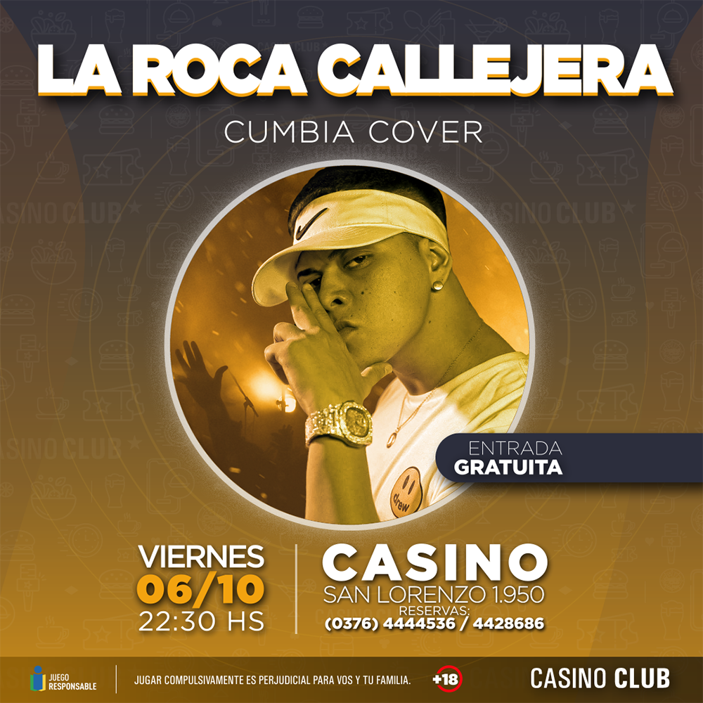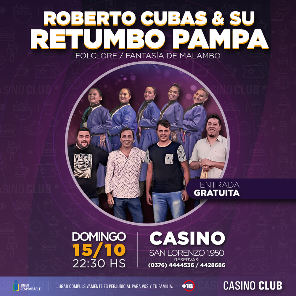 El Casino Club ofrecerá shows en vivo todos los jueves, viernes y sábado de octubre. Así habrá diversión los jueves en su sala de Garupá, ubicada sobre la ruta Nacional 12 en el kilómetro 8,5; los viernes en su local de Quaranta, ubicado sobre la avenida Quaranta 6045; mientras que Casino Central, sobre San Lorenzo 1950 irá variando los entre los tres días. En todos los casos, siempre desde las 22.30 horas.