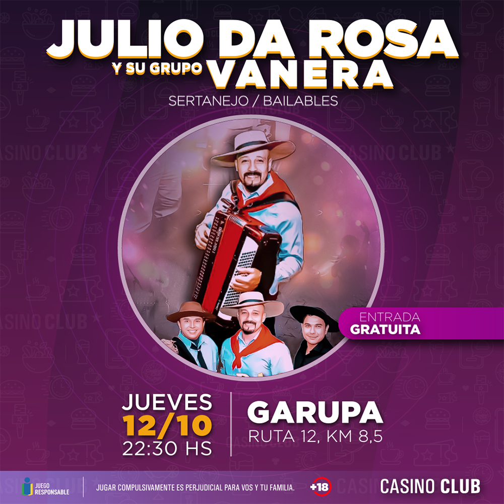 “Julio Da Rosa y su grupo Vanera” brindará un show alegre de comienzo a fin. Con estilos bien regionales desde el chamamé al Sertanejo brasilero. Habiendo recorrido la provincia entera llega a Casino Club Garupá para llenarte de música.