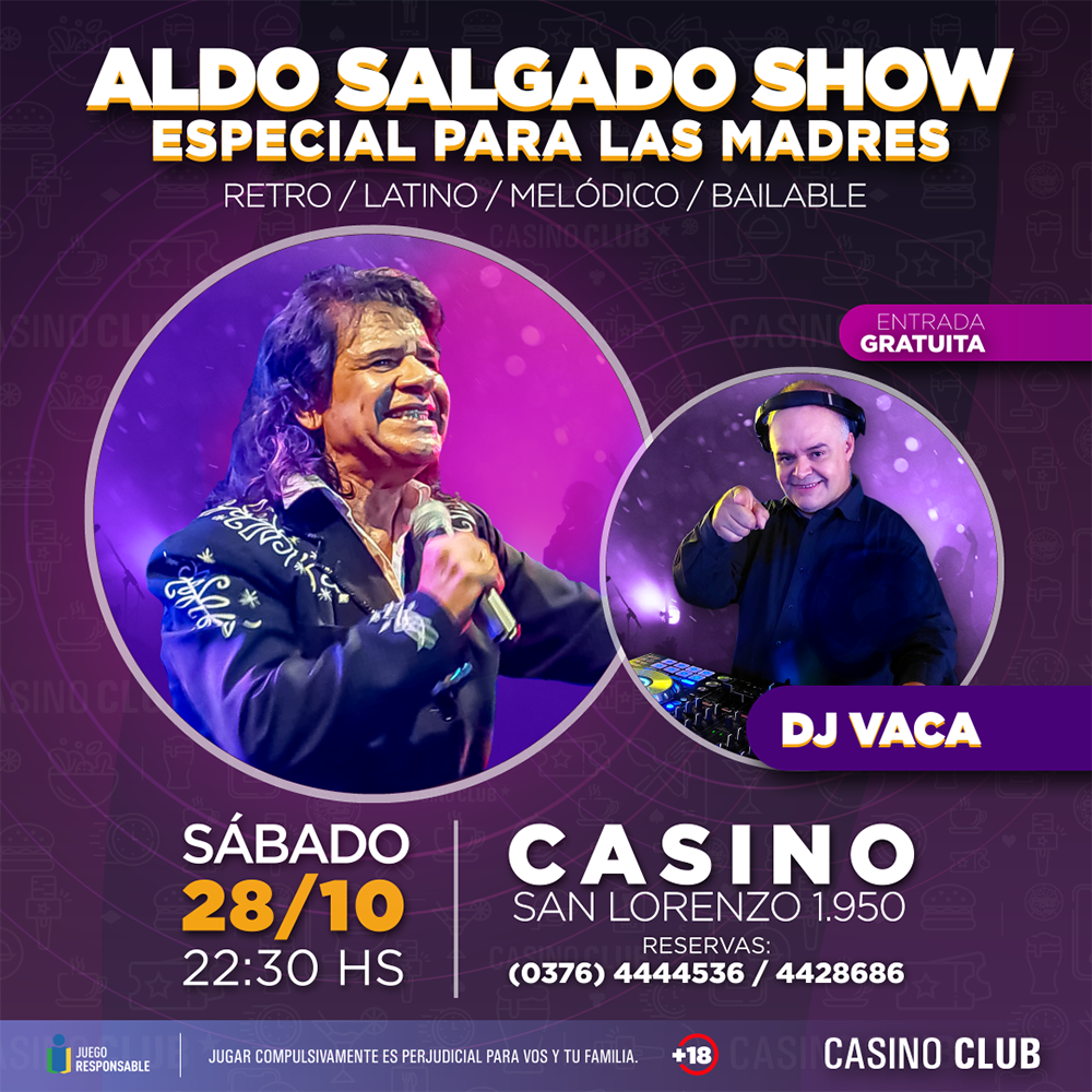 Homenajeamos a las Madres con un show romántico para emocionarse, cantar y bailar, junto a Aldo Salgado. Con más de 40 años de trayectoria ininterrumpidos, desde sus inicios musicales, en la provincia de Buenos Aires, con su banda “Osiris” (voz principal), seguido de liderar en la banda “Los New Dollars” en la provincia de Misiones (voz principal) por más de 18 años, en donde ha compartido con reconocidos músicos de la actualidad; hoy, como solista, recorriendo toda la provincia de Misiones, Paraguay y Corrientes; nombrado en el año 2015 por el Honorable Concejo Deliberante a “Reconocimiento a la trayectoria” y convocado en el año 2022 como “Telonero Oficial” de Palito Ortega ante más de 8.000 personas