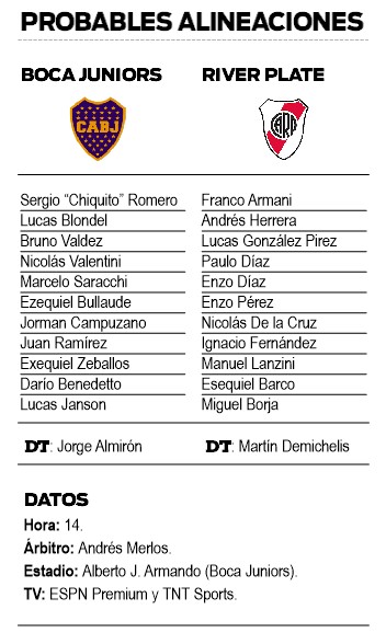 El partido que hoy acaparará toda la atención se jugará en el barrio porteño La Boca en un inusual horario de las 14, será arbitrado por el mendocino Andrés Merlos y televisado por las señales ESPN Premium y TNT Sports.
