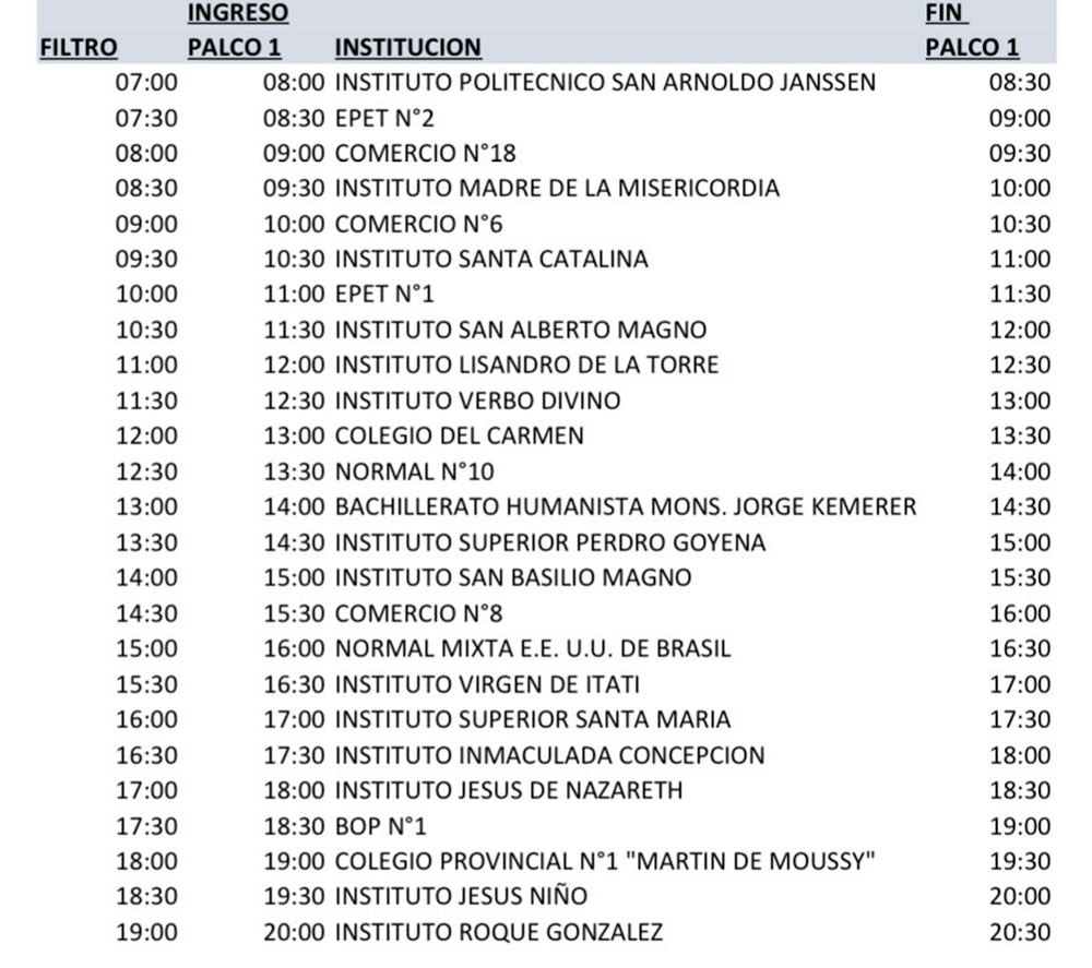 El Instituto Politécnico San Arnoldo Janssen será el encargado de abrir la jornada a las 7. Mientras que el Instituto Roque González culminará el ensayo a las 19.