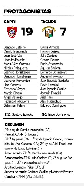 Por su parte, CAPRI B se recuperó de la derrota sufrida en la fecha pasada ante Carayá de Eldorado, en Villa Cabello, y como local se impuso ayer ante Mamangá de Montecarlo por un contundente 54-0, en el marco de la Zona B del certamen.