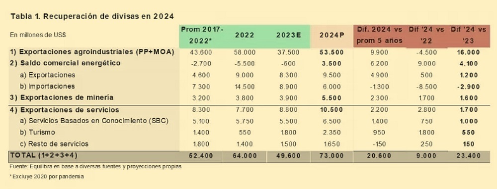 En el desagregado, creemos que los Servicios Basados en Conocimiento podrían aportar US$ 1.000 millones más y el turismo US$ 550 millones extras que lo aportado en 2023. En suma, para 2024 las proyecciones de todos los sectores de bienes y servicios mencionados muestran una mejora anual de US$ 23.400 millones disponibles frente a este año.