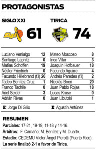 Los de Jorge Di Gilio buscaron achicar la brecha en los últimos diez minutos con Schoffen (19) y Venialgo (12), sin embargo las cartas ya estaban echadas: fue “Juampi” Rojas el encargado de levantar el trofeo para Tirica.