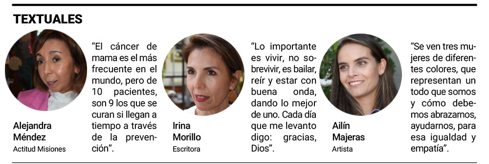 Entre los artistas presentes, Ailín Majeras contó que “me convocaron para diseñar el logo y utilizarlo durante este mes rosa”. Con el arte, “es una forma de visibilizar y un granito de arena de mi parte”. Además de la frase “por mí, por ti, por todas”, el logo tiene unas flores “que representan la mama en el cuerpo de la mujer, sumado al símbolo mundialmente reconocido como prevención del cáncer. Entonces, hicimos una enredadera representando este lazo”.