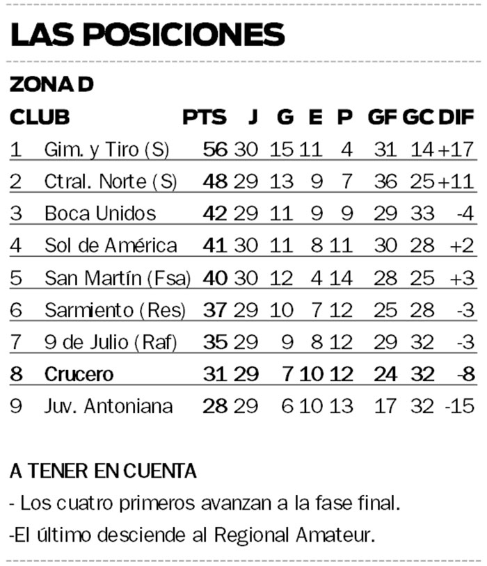 Después de mucho tiempo, Crucero del Norte, tendrá una semana relativamente tranquila. Y es que luego del triunfo del último domingo en Rafaela ante 9 de Julio, por 1-0 y por la 32° fecha del Torneo Federal A, logró salir de la última posición de la Zona D y escaparle así al menos momentáneamente a la zona de descenso.