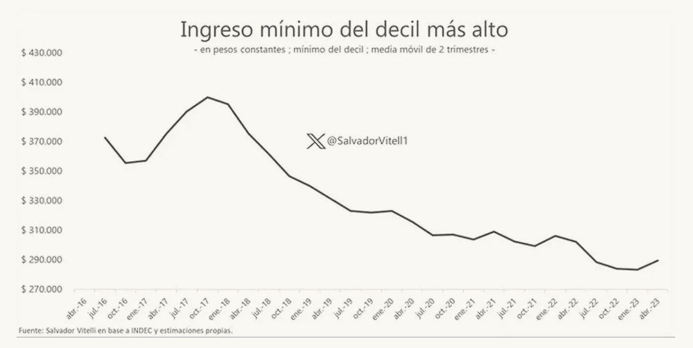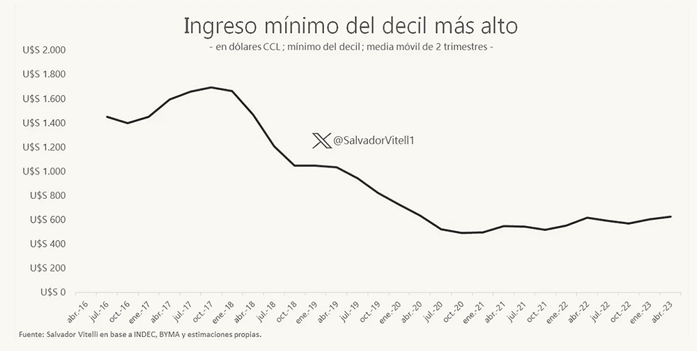 “Medida en dólares promedio de cada trimestre, por cómo se ha overshooteado el dólar, nos da un descenso bastante significativo. En el tercer trimestre de 2017, el ingreso mínimo del decil más rico era de US$ 1.700, mientras que ahora estamos en torno a los US$ 600. Esto es una caída del 65% medido en dólares”, marcó.
