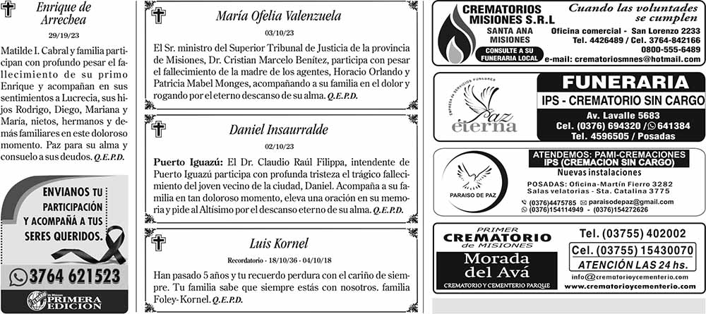 Fúnebres del Miércoles 4 de Octubre de 2023