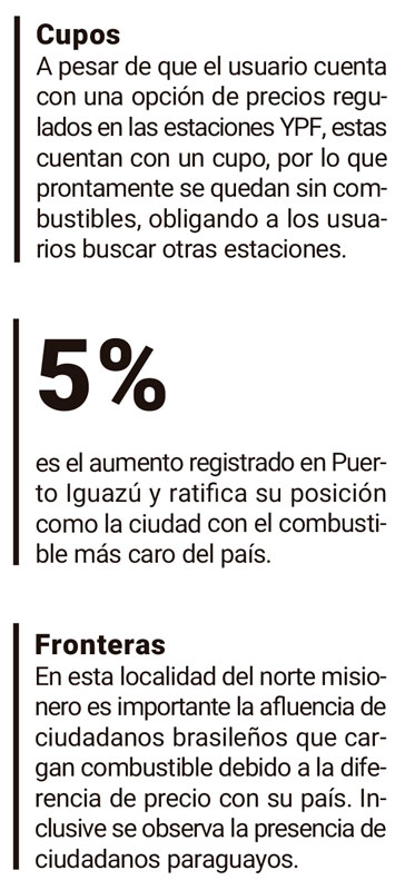 La ciudad más afectada fue Puerto Iguazú, donde se registró un aumento del 5% en todos sus combustibles y amplía, así, la brecha de precios con otras partes del país. De esta manera los tótem de precios de la Ciudad de las Cataratas marcaron el litro de nafta súper en $405 y $465 el litro de la V-Power (premium); por su parte el Fórmula Diésel está $437 el litro y la V-Power Diésel ya se encuentra en $530 el litro.
