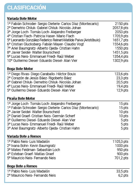 Puerto Rico es el único club que mantiene la categoría bote a remos y este fin de semana los grandes protagonistas fueron Pablo Neis y Luis Madalón, que se quedaron con el primer puesto en pesca variada y de la boga. Curiosamente no hubo capturas de pirañas.