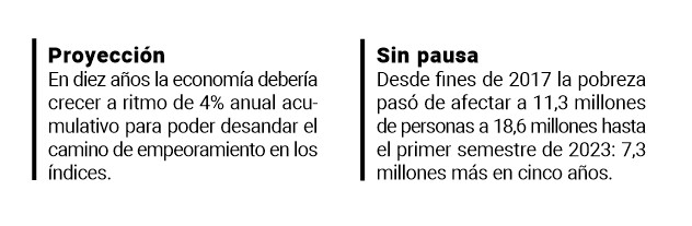 Una estimación del economista Leopoldo Tornarolli, de la Universidad Nacional de La Plata y de Cedlas, especializado en mediciones de pobreza por ingresos, arrojó que en la próxima década la economía debería crecer a ritmo de 4% anual acumulativo solamente para poder desandar el camino de empeoramiento en los índices que se registra desde el segundo semestre de 2017, cuando fue de 25,7% de la población.
