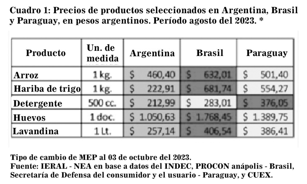 Para explicar este fenómeno, Schwarz y Cuevas seleccionaron cinco productos (arroz, harina de trigo, detergente, huevo y lavandina) y compararon sus precios en Argentina, Brasil y Paraguay.