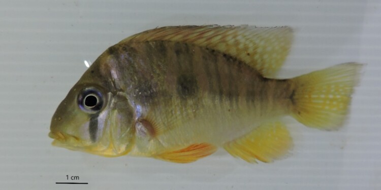 Descripción: cuerpo orbicular, el perfil cefálico entre el extremo del hocico y el origen de la aleta dorsal es recto. Los machos en época reproductiva poseen un perfil cefálico formado por la presencia de una giba frontal. Las escamas del flanco son ctenoides (suaves al tacto), presenta 26 a 28 escamas en la serie longitudinal. La aleta dorsal posee 12 a 14 radios espinosos y 13 a 15 radios blandos y tiene escamas en su tercio basal. En los machos, el extremo distal de esta aleta termina en punta y sobrepasa la base de la aleta caudal. La aleta anal presenta escamas a partir del tercer radio blando, el extremo distal es redondeado y se extiende más allá de la base de la aleta caudal; además presenta pequeñas escamas ctenoides cubriendo las tres cuartas partes de su superficie. La mitad dorsal del flanco es celeste iridiscente y la mitad ventral y el tórax son amarillos. Los flancos llevan barras verticales pares negras o grises. Hay una mancha negra cuadrangular en la mitad del flanco. El opérculo y las porciones blandas de las aletas dorsal y anal tiene motas iridiscentes azules y en las aletas algunas son blancas. El color de las aletas pélvicas, caudal y dorsal es azul y anaranjado.