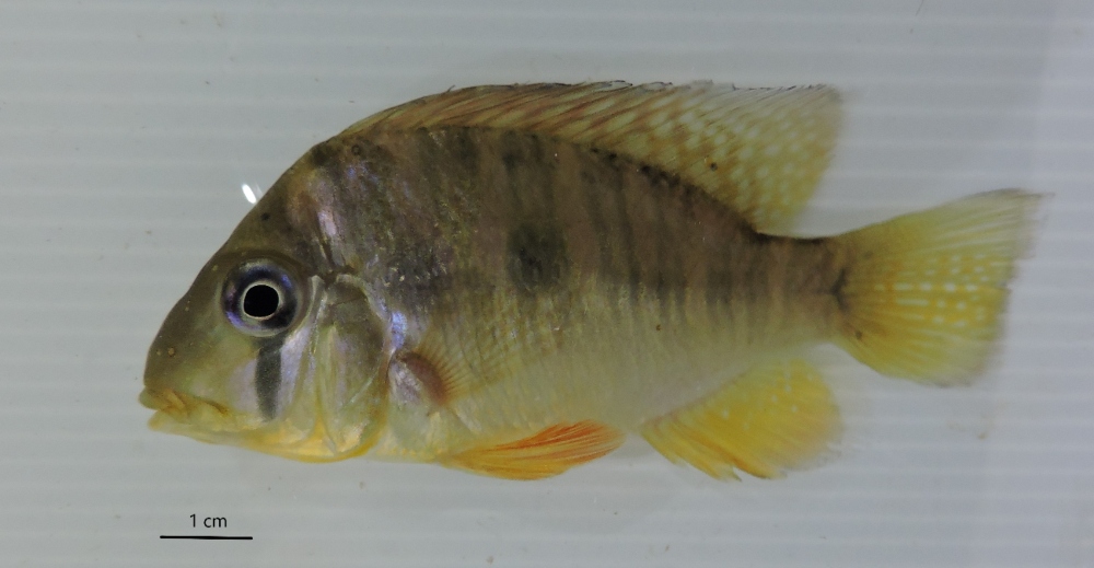 Descripción: cuerpo orbicular, el perfil cefálico entre el extremo del hocico y el origen de la aleta dorsal es recto. Los machos en época reproductiva poseen un perfil cefálico formado por la presencia de una giba frontal. Las escamas del flanco son ctenoides (suaves al tacto), presenta 26 a 28 escamas en la serie longitudinal. La aleta dorsal posee 12 a 14 radios espinosos y 13 a 15 radios blandos y tiene escamas en su tercio basal. En los machos, el extremo distal de esta aleta termina en punta y sobrepasa la base de la aleta caudal. La aleta anal presenta escamas a partir del tercer radio blando, el extremo distal es redondeado y se extiende más allá de la base de la aleta caudal; además presenta pequeñas escamas ctenoides cubriendo las tres cuartas partes de su superficie. La mitad dorsal del flanco es celeste iridiscente y la mitad ventral y el tórax son amarillos. Los flancos llevan barras verticales pares negras o grises. Hay una mancha negra cuadrangular en la mitad del flanco. El opérculo y las porciones blandas de las aletas dorsal y anal tiene motas iridiscentes azules y en las aletas algunas son blancas. El color de las aletas pélvicas, caudal y dorsal es azul y anaranjado.