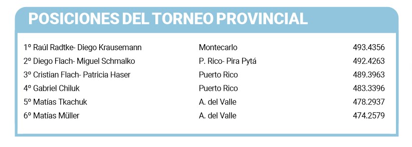 Los montecarlenses Raúl Radtke y Diego Krausemann tienen una oportunidad única para arrebatarle el cetro a los actuales campeones, Diego Flach y Miguel “Choli” Schmalko, pese a que la diferencia es de solo un punto en favor de los pescadores del Alto Paraná.