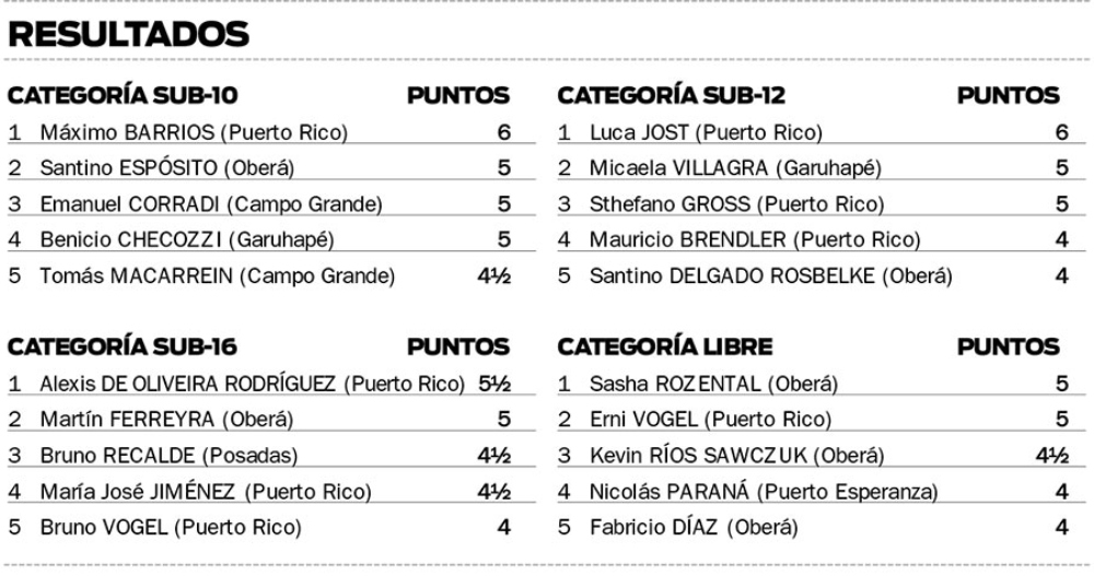 Por su parte, en la Sub-16, Alexis De Oliveira Rodríguez se impuso en la divisional, a la vez que lo siguieron en la tabla Martín Ferreyra y Bruno Recalde. Finalmente, en Libres, el ganador fue el juvenil Sasha Rozental, que superó en una atrapante final al experimentado Erni Vogel. En el último escalón del podio se ubicó Kevin Ríos Sawczuk.