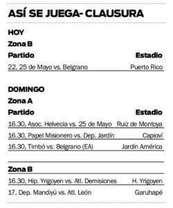 En Capioví, el líder Deportivo Jardín visitará a Papel Misionero, a las 16.30. En Jardín, Timbó será anfitrión de Belgrano, en el mismo horario.