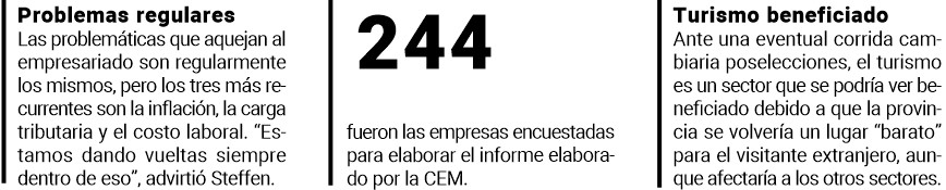 A pesar de que los resultados varían dependiendo de los diferentes rubros consultados (comercio, turismo, industria y servicios), les permitió a los encuestadores llegar a conclusiones generales en cuatro ejes fundamentales.