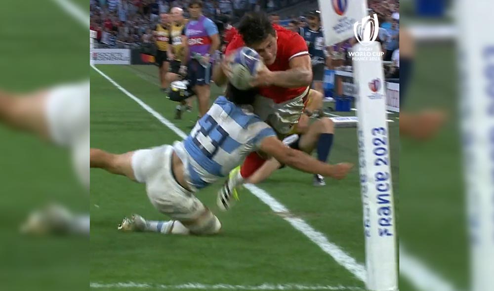Cuando Los Pumas ganaban por solo dos puntos, Louis Rees-Zammit estaba a punto de anotar un try que pudo haber significado la victoria para los galeses. Pero en ese momento apareció Matías Moroni con un tackle histórico para sacarlo de la cancha y conseguir el line en defensa para el combinado nacional.