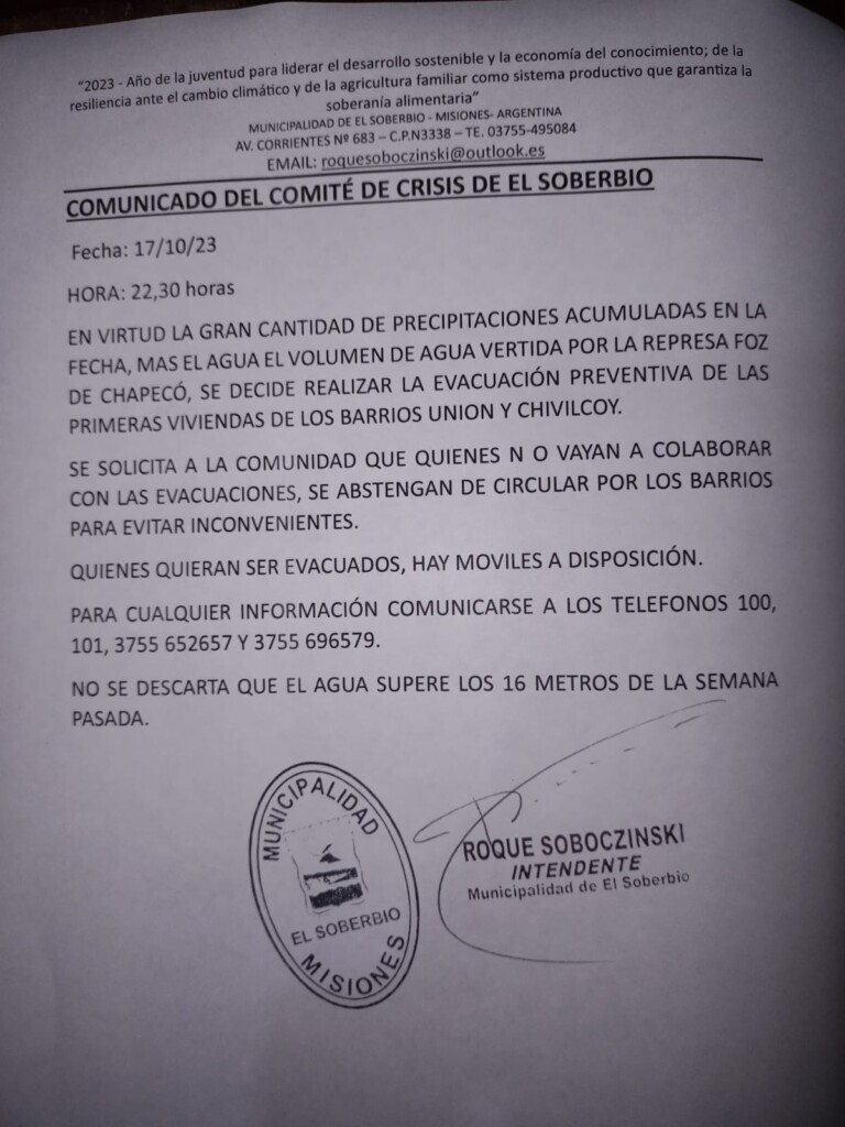 En una reunión de emergencia del comité de crisis de El Soberbio, se decidió iniciar la evacuación de al menos 30 familias.