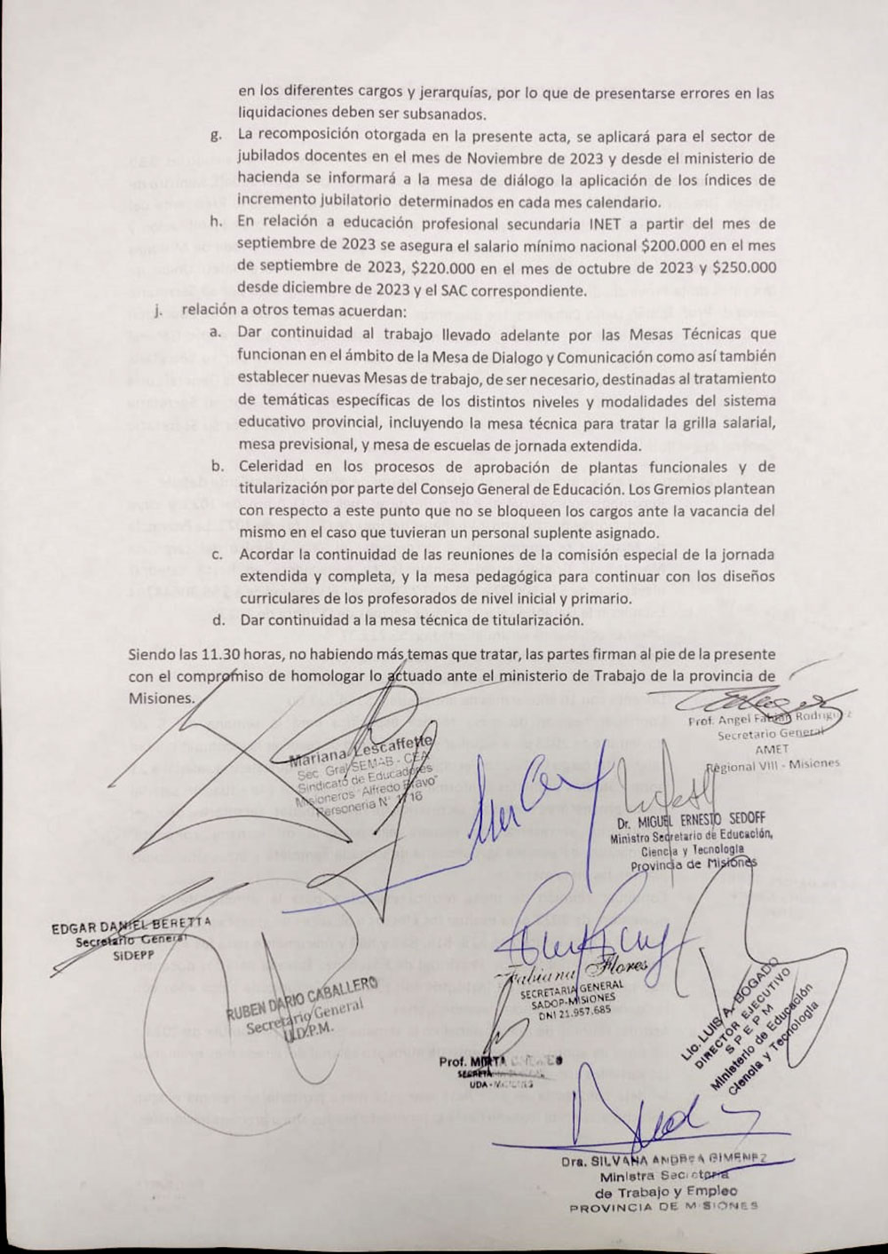 En tanto, según precisó la secretaria general de la Unión de Docentes Argentinos (UDA), Mirta Chemes, “se incorporó una cláusula según la cual los maestros de la escuela secundaria profesional cobrarán el equivalente a la garantía nacional desde septiembre (200.000) 220.000 pesos en octubre y 250.000 en diciembre más el SAC. También se mejorarán las liquidaciones salariales de preceptores, bedeles y secretarios del nivel superior, secretarios de nivel secundario y secretarios de escuelas agropecuarias de jornada completa. Estas correcciones salariales planteadas se irán trabajando en mesa técnica específica prevista para la semana del 5 de noviembre, cuyo resultado se llevará a la próxima mesa salarial”, precisó Chemes.