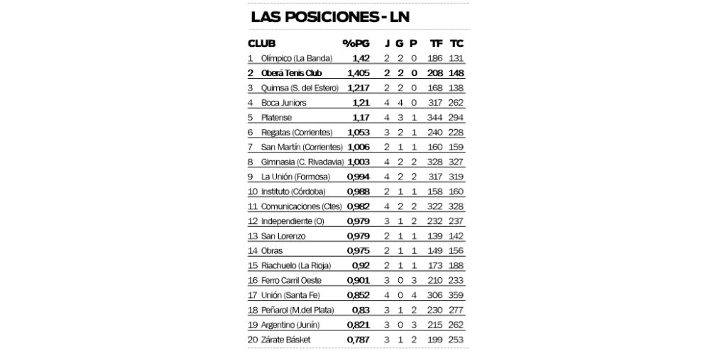 Gracias a estos resultados, el Celeste se ubica en el segundo lugar, detrás de Olímpico de La Banda, que tiene mejor cociente. Y está por delante del último campeón Quimsa de Santiago del Estero.