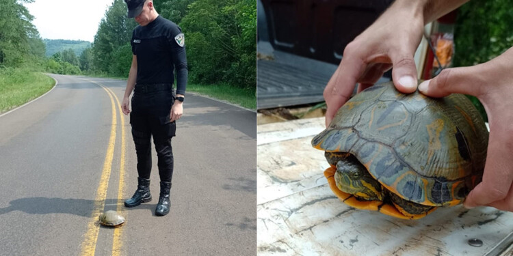 En ese contexto, sobre la citada ruta provincial, hallaron a la tortuga acuática hembra, que pertenecería a la especie orejas amarillas, procediendo a su resguardo y posterior liberación río abajo, en su hábitat natural