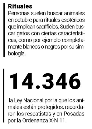 “Durante octubre no entregamos en adopción ni gatos ni perros negros o blancos. Piden, están pidiendo, pero no entregamos, sabemos fehacientemente que esto sucede, y que ha sucedido en Iguazú, porque hace dos años hicimos una denuncia como protectora que terminó en un allanamiento en una vivienda del barrio Las Leñas donde se practicaban este tipo de ritos satánicos con animales”.