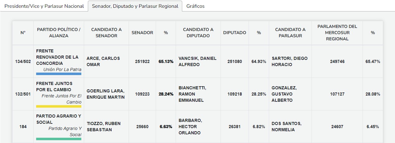 Con estos resultados, en diciembre asumirán Carlos Arce y Sonia Rojas Decut como senadores por la Renovación; y lo mismo harían Daniel “Colo” Vancsik, Yamila Ruíz y Alberto Arrúa como diputados nacionales. En tanto, Martín Goerling como senador y Emanuel Bianchetti como diputado nacional obtuvieron su banca por la minoría.