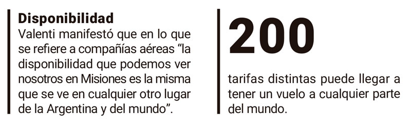 Consultada sobre el tema, Valenti manifestó que en lo que se refiere a compañías aéreas “la disponibilidad que podemos ver nosotros en Misiones es la misma que se ve en cualquier otro lugar de la Argentina y del mundo”.