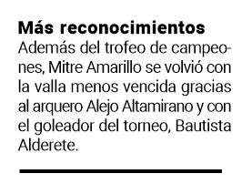 Además, el arquero Alejo Altamirano fue reconocido con la valla menos vencida y Bautista Alderete fue el goleador del equipo y del torneo.