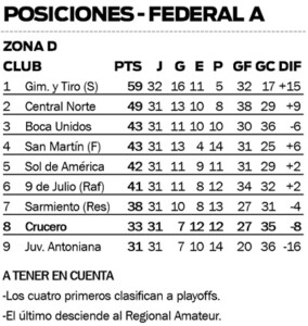 Un triunfo sentenciará la permanencia del Colectivero sin importar lo que suceda entre Juventud Antoniana y Sarmiento de Resistencia, que jugarán en Salta en el mismo horario. Ahora bien, si Crucero empata y Juventud vence a los chaqueños, se produciría un hipotético empate en puntos que obligaría a misioneros y salteños a jugar un partido desempate en cancha neutral. Por eso, Crucero también le prende velas a Sarmiento, que ya no juega por nada pero puede darle una gran mano en caso de un triunfo o hasta un empate, lo de que determinará el descenso de Juventud sin importar lo que suceda en Garupá.