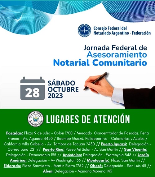 Este sábado, de 8 a 13 horas, los escribanos estarán en la plaza 9 de Julio de Posadas y en caso de lluvia, se trasladarán hasta la sede del Colegio Notarial, calle 25 de Mayo y Bolívar. Además, realizarán la jornada en Villa Cabello, en el espacio cedido en Supermercado California, junto con el Mercado Concentrador de Posadas y también en Itaembé Guazú (Calandrias y Azaleas). Por otra parte, recibirán consultas en las delegaciones del interior del Colegio, como Apóstoles, Oberá, Eldorado, Puerto Iguazú, Capioví, Leandro N. Alem, entre otros municipios.