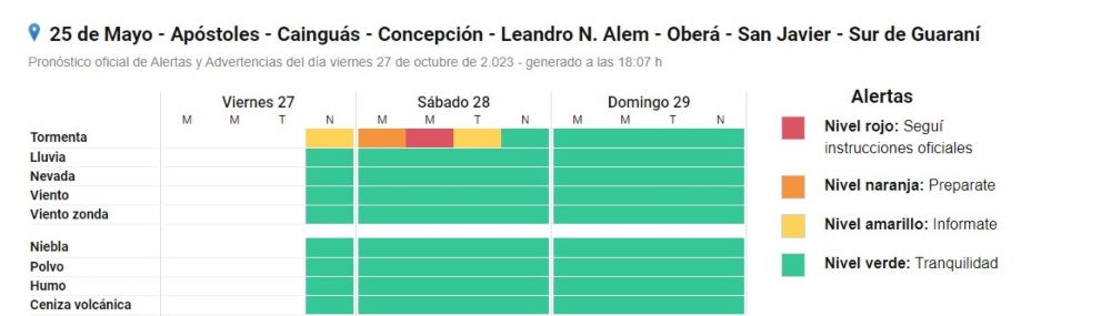 El alerta roja es para los departamentos de 25 de Mayo, Apóstoles, Cainguás , Concepción ,Leandro N. Alem, Oberá, San Javier y el sur de Guaraní.