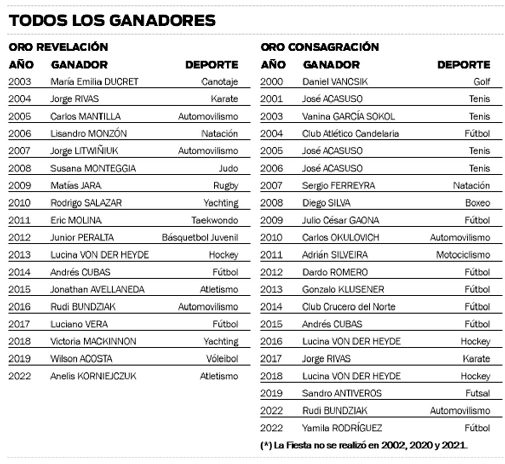 Claro que la máxima atención estará centrada en el cierre dorado de la noche, ya que nuevamente se entregará el Oro Consagración al deportista misionero con mayores logros a lo largo de 2023, mientras que también será de la partida el Oro Revelación, reservado para la principal promesa juvenil de la tierra colorada.