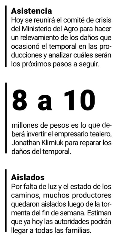 El empresario tealero Jonathan Klimiuk contó a este matutino que la tormenta dejó daños millonarios en su establecimiento de Salto Encantado, con voladura de depósito de chip y varias chapas.