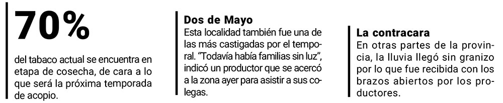 Por su parte, el subsecretario del Tabaco, Carlos Pereira, confirmó que recorrió las zonas afectadas y anticipó que el miércoles a la mañana se reunirán con los gremios y las empresas en la Asociación de Plantadores de Tabaco de Misiones (APTM) para hacer una evaluación de la situación.