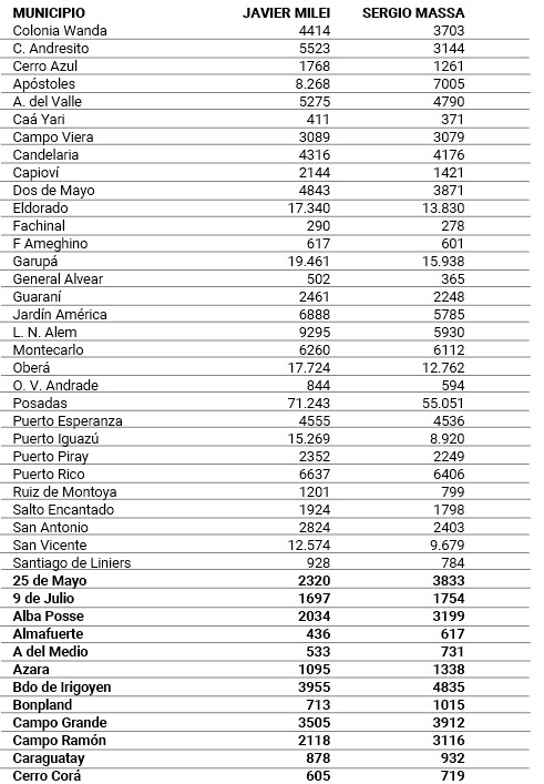 Como contrapartida, los municipios más pequeños generaron un “goteo” de votos en favor de Massa que fueron desde 10 votos a otros casos donde la diferencia fue importante. Se destacan diferencias como por ejemplo 2.300 votos a favor de Massa en San Pedro; otros 2.000 en El Soberbio, 1.500 en 25 de Mayo, 1.100 en Alba Posse, y 1.000 en Campo Ramón.