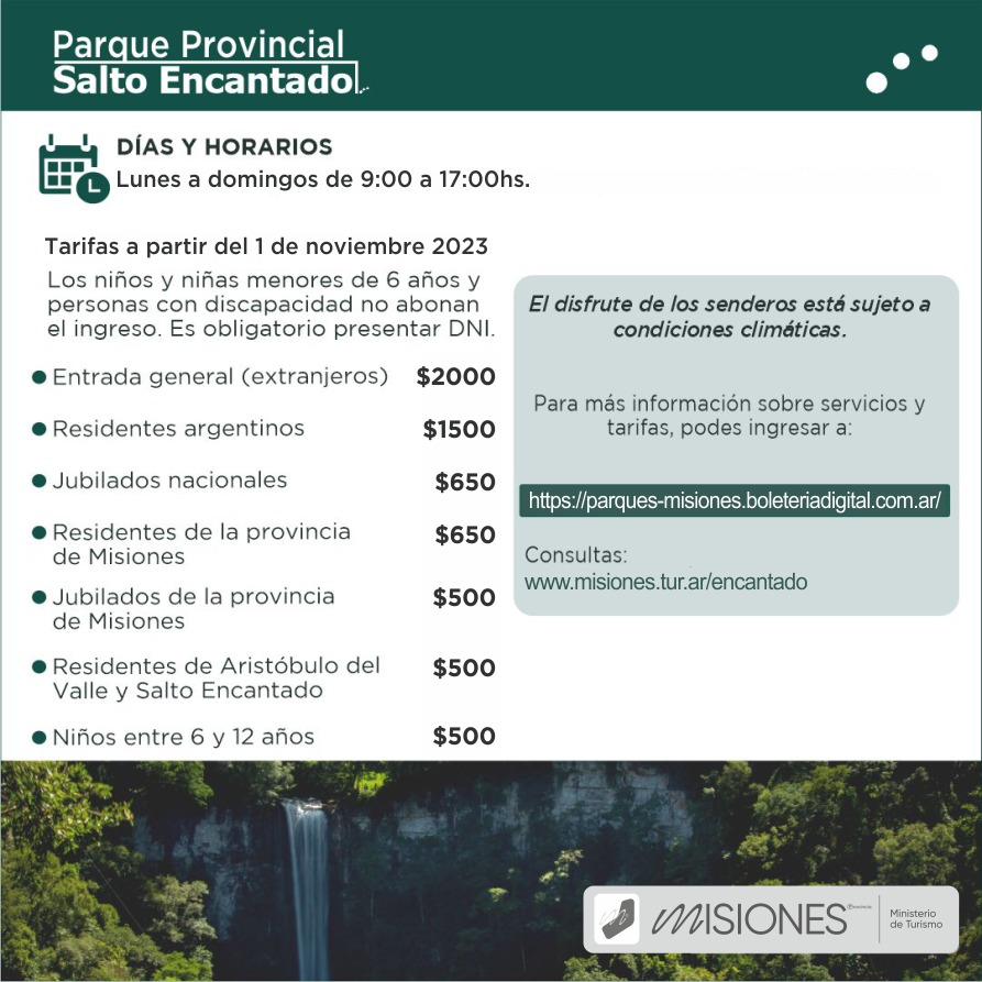 Así, los menores de 6 años y personas con discapacidad, entran gratis; menores de entre 6 y 12 años y los jubilados provinciales, abonarán $500; residentes de Misiones y jubilados nacionales, $650; los residentes argentinos $1500, mientras que la entrada general (extranjeros) es de $2000.