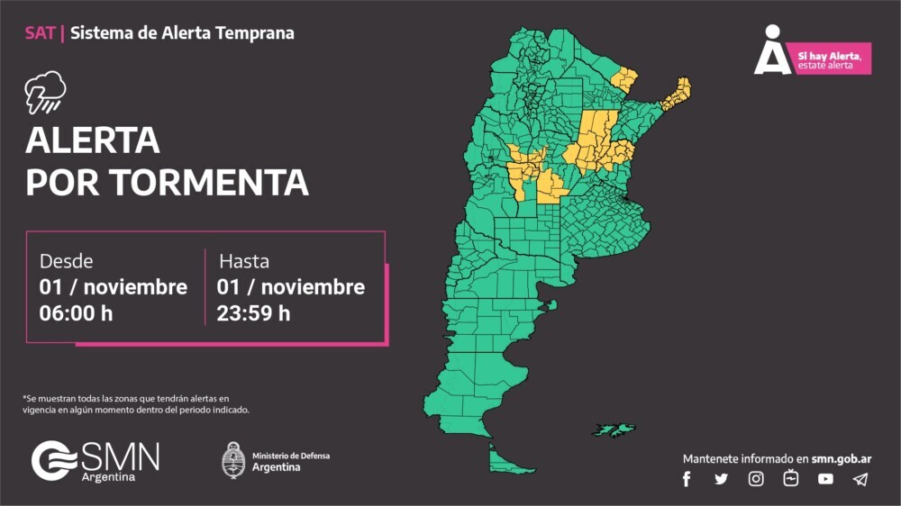 El Servicio Meteorológico Nacional lanzó una advertencia “amarilla” para la tierra colorada, que “será afectada por tormentas de variada intensidad, algunas localmente fuertes”, indicó. Las mismas pueden estar acompañadas de ráfagas, granizo y abundante lluvia en cortos períodos.