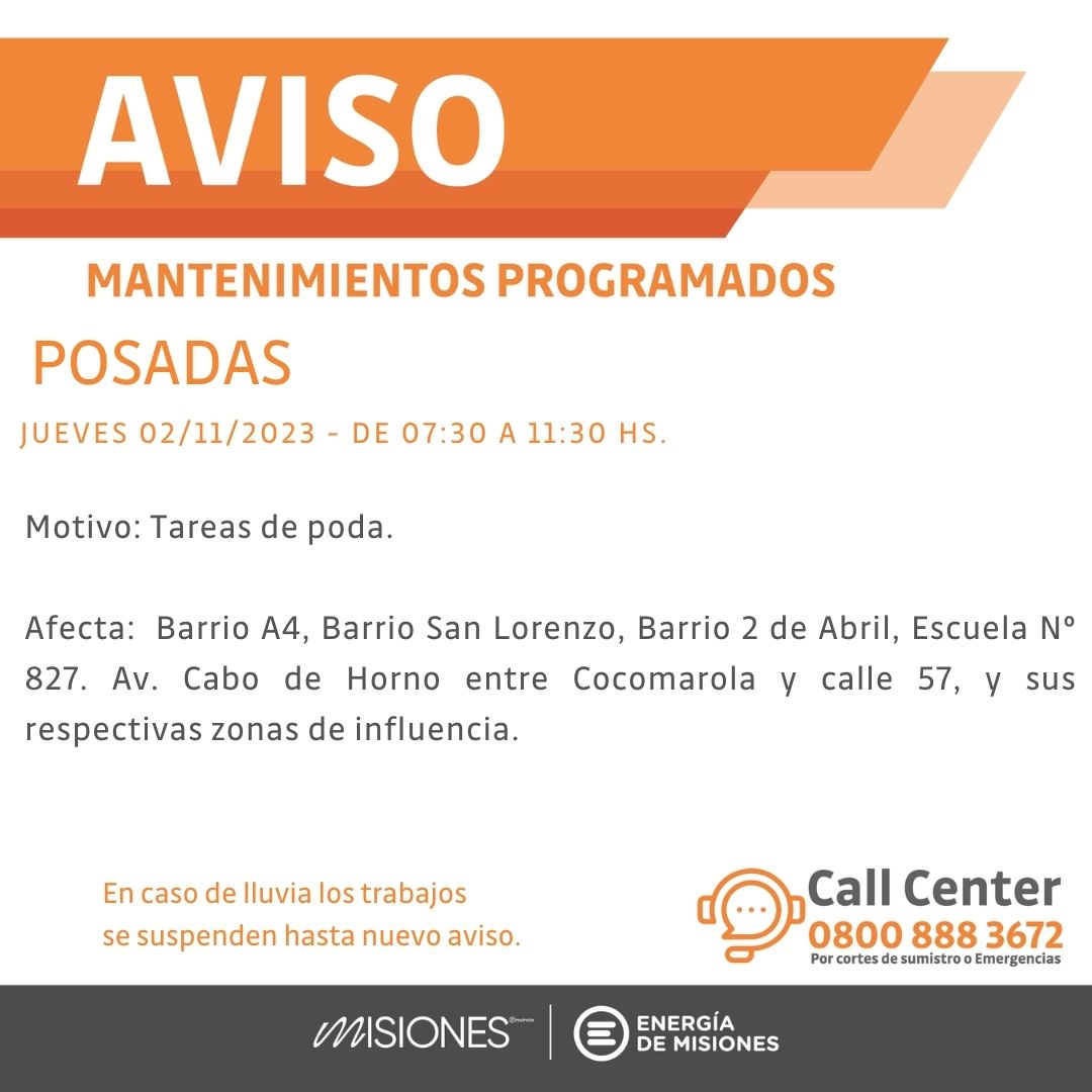 De acuerdo a lo informado por la empresa, desde las 7.30 hasta las 11.30, habrá afectación del servicio de energía eléctrica debido a trabajos de poda y cambios de postes de madera a hormigón.
