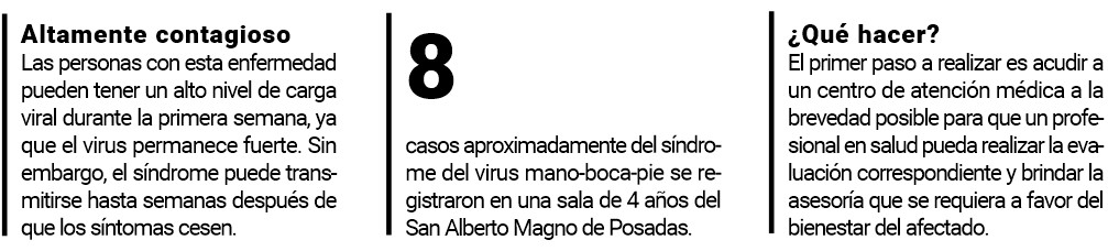 Un aumento en las consultas pediátricas por el virus que provoca el síndrome mano-boca-pie en Misiones enciende las alarmas entre los padres de niños menores de cinco años. Se trata de una infección viral leve y contagiosa frecuente en los pequeños que se manifiesta con fiebre y con pequeñas ampollas o pápulas en unas partes concretas del cuerpo por fuera y dentro de la boca (paladar, encías, lengua), y sarpullido en las manos y los pies, incluso en la zona genital.