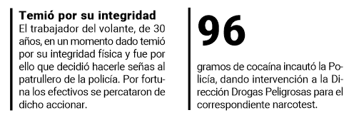 Uno de los presuntos pasajeros bajó del vehículo y comenzó a correr, arrojando en su huida una bolsita de color negro, que al ser requisada se supo que contenía 96 gramos de clorhidrato de cocaína, indicó un vocero.