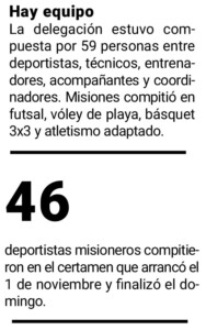 El certamen arrancó el 1 de noviembre y finalizó el pasado domingo, y la delegación misionera estuvo compuesta por 46 deportistas más técnicos, entrenadores, acompañantes y coordinadores. La provincia compitió en futsal, vóley de playa, básquet 3×3 y atletismo adaptado.