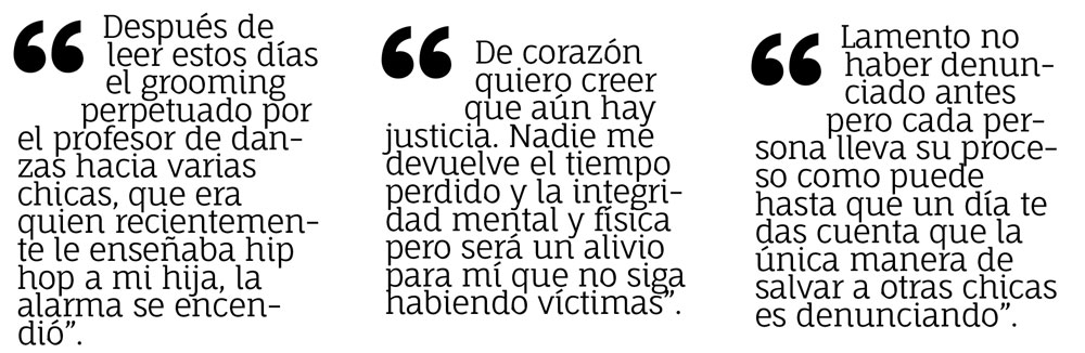“Después de leer estos días el grooming del profesor de danzas quien recientemente le enseñaba hip hop a mi hija, la alarma se encendió y con solo imaginar que ella podría sufrir algo parecido… dije basta, porque Bernardo Neumann siguió enseñando. Me causó un nudo en el estómago suponer que posiblemente habrían más chicas. A mí me traumó de por vida”, explicó.
