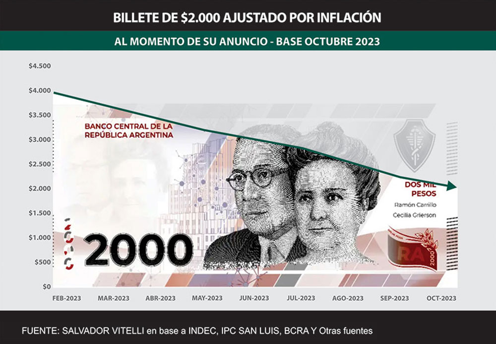 El flamante papel de $2.000, que empezó a circular hace menos de 6 meses, ya perdió casi la mitad de su valor real, a causa de una inflación de más de 10% mensual que se registra desde agosto.