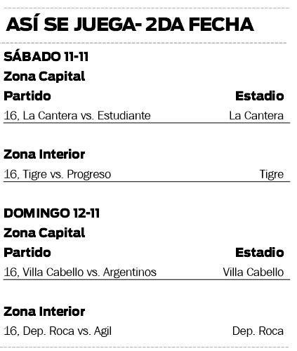 Por su parte, los otros dos encuentros previstos para el domingo lo animarán Atlético Villa Cabello frente a Argentinos Juniors, en cancha del primero, a las 16.