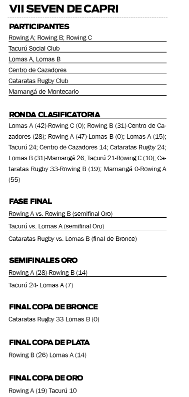 El VII Seven de CAPRI ofreció una verdadera fiesta ayer en la chacra 156 de Villa Cabello, donde los clubes invitados se reunieron a mover la ovalada en honor a uno de los grandes referentes del rugby de Rowing, Carlos Alberto “Beto” Álvarez.