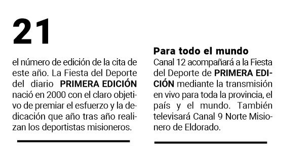 La cuenta regresiva ya comenzó de cara a la Fiesta del Deporte 2023 de PRIMERA EDICIÓN, la tradicional gala del deporte misionero que le pondrá -una vez más y como ya es tradición- el broche de oro a una temporada plagada de logros para los representantes de la tierra colorada, tanto a nivel provincial, como nacional e internacional.